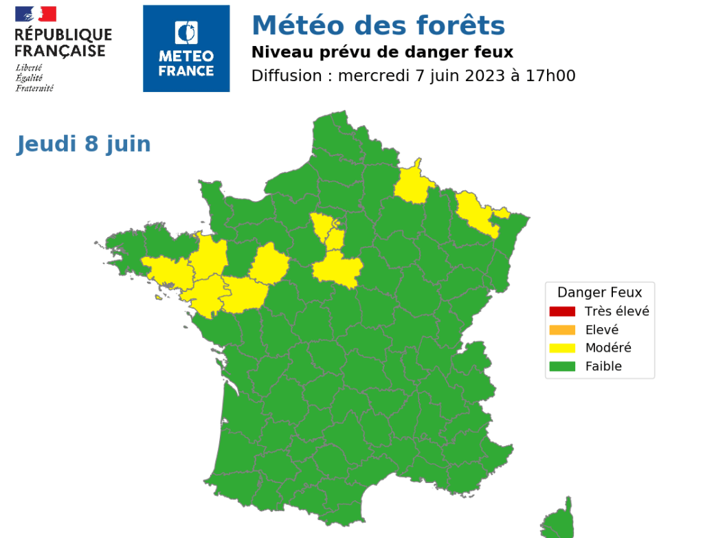 Dans un objectif de prévention des feux et pour que chacun adapte ses comportements en fonction du danger prévisible, Météo France diffuse une météo des forêts qui indique un niveau de danger de feux de forêts établi à partir des prévisions météorologiques et l’état de sécheresse de la végétation.