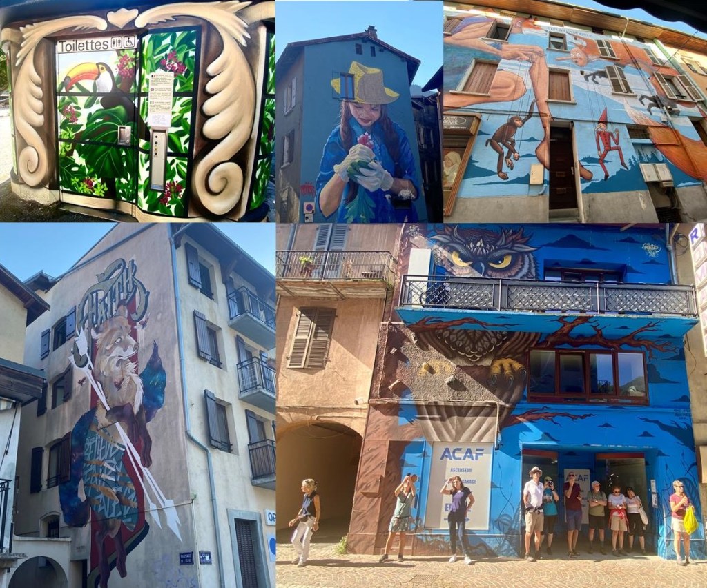 Réunion des 2 groupes pour déambuler dans les rues tristounettes de Moustiers. La ville semble décalée dans l’espace-temps des années d’après-guerre En compensation, la ville a fait appel à de nombreux artistes depuis 2018, pour s’offrir un « Street art » du XXIème siècle très original et surprenant, où même le mobilier urbain (y compris les toilettes !) est abandonné aux artistes plutôt qu’aux publicitaires.