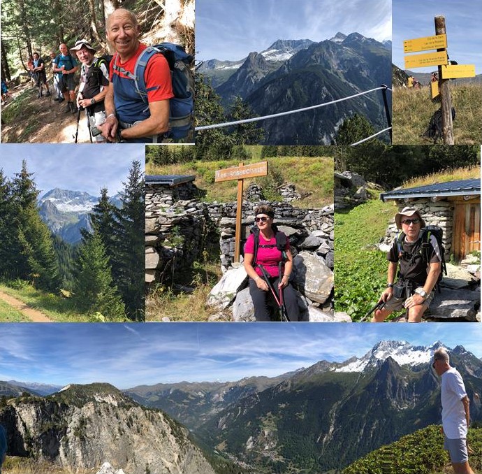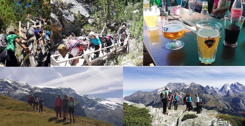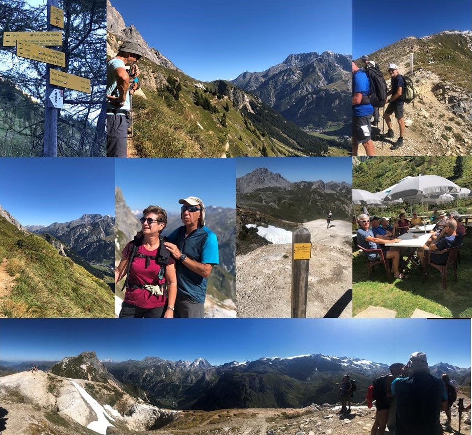 Grand beau temps, mais un orage à la mi-août a emporté une passerelle sur le parcours prévu. Changement de programme obligatoire. Ce sera un départ à pied du centre pour atteindre le Roc de Villeneuve qui surplombe le village de Pralognan. Après une montée au milieu des arbres, nous débouchons dans un espace déboisé pour rejoindre le col du Golet et le roc de Villeneuve à 2196 mètres. Superbe panorama sur les glaciers de la Vanoise.
