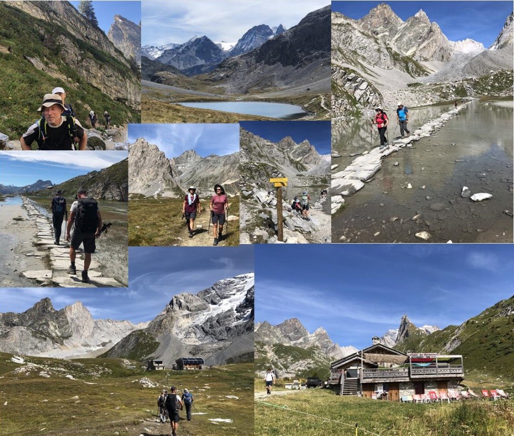 Depuis le refuge, nous avons une superbe vue sur la Grande Casse et son glacier. Après avoir déjeuné près de ce refuge, nous entamons le retour et la descente en traversant le lac des vaches et son étonnant cheminement de pierres plates qui nous donne l’impression de marcher sur l’eau.
