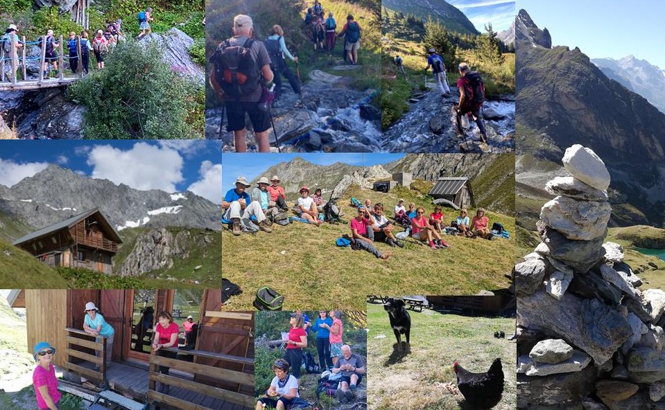 Départ vers le refuge du Grand Bec, au pied du Grand Bec (3300 m). un sentier régulier en lacets, dans la rocaille, nous amène vers l’objectif 2405 m, le refuge. Sa source potable dans un tronc évidé et un névé survivant nous rafraîchissent. En contrebas du refuge, le petit lac de la Vuzelle prend la pose pour la photo. Les 2 poules du refuge accourent de leur poulailler-tonneau pour partager le pique-nique. Redescente par le même chemin et nous finissons la randonnée en beauté, dans les coussins douillets de notre café préféré.