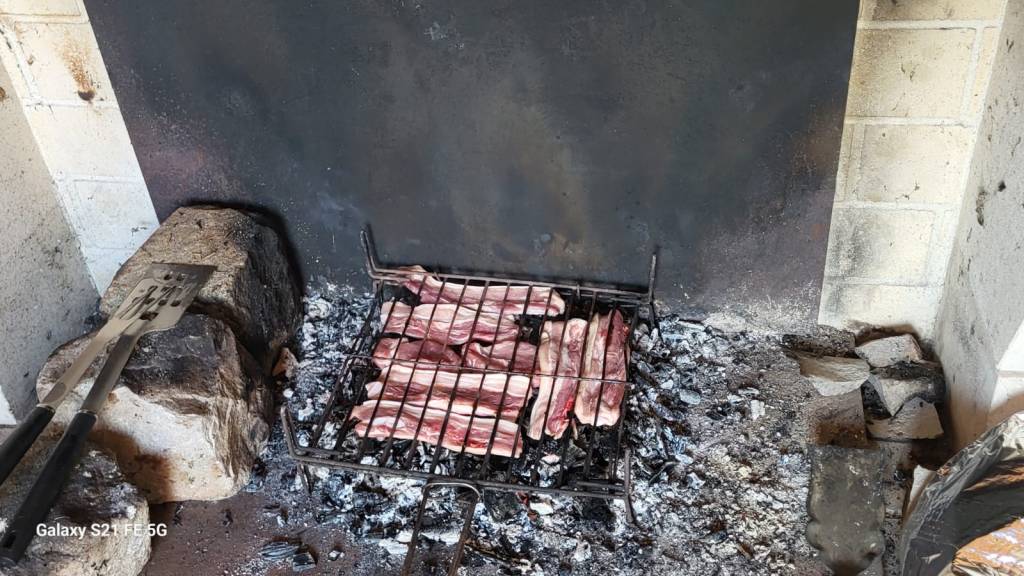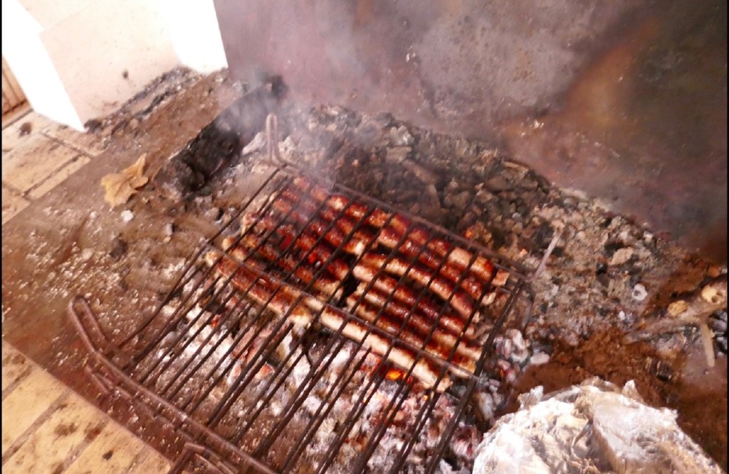 Tables avec nappe blanche sur la terrasse ensoleillée et saucisses-ventrèche, en train de griller au feu de bois, dans la cheminée…