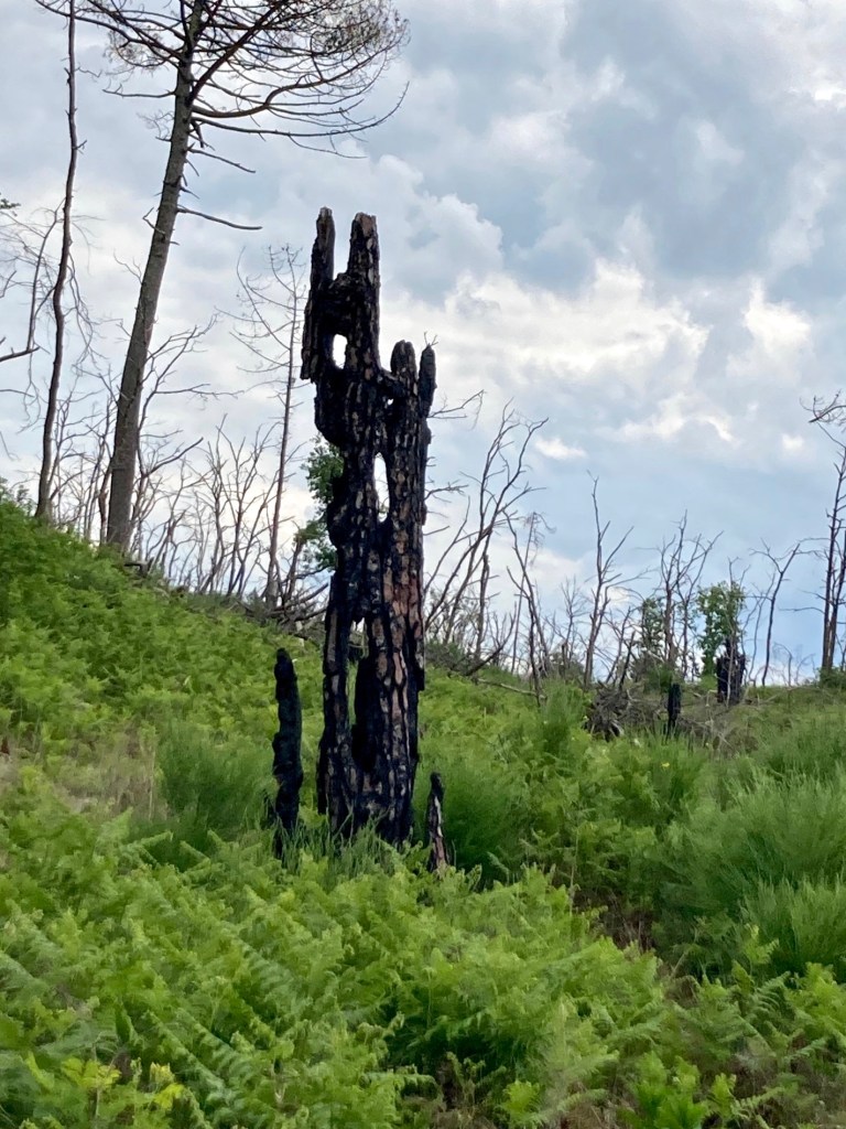 Puis nous avons franchi une ligne où fougères, ajoncs, bruyères, genêts ont pris possession de la lande, quelques squelettes d’arbres surgissaient de temps en temps, nous donnant la cruelle vision des ravages du Feu.