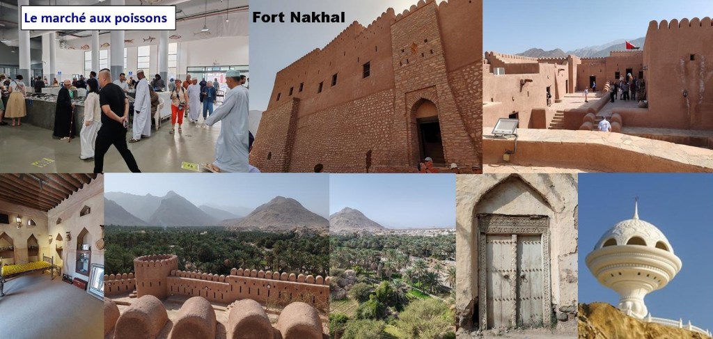Lundi 2 février: A Mascate, visite du marché aux poissons. De nombreuses espèces connues ou inconnues pour nous (thons, barracudas, crevettes, carangues, etc). Puis visite du fort Nakhal datant du 16ème siècle. Pour terminer notre voyage, la promenade en boutre et nous découvrons un littoral déchiqueté avec de profonds fjords et de multiples criques. Perchée sur une corniche de Mascate, dominant la mer, se dresse une étonnante structure de béton blanc : un brûleur d’encens de 25 m de haut. Ce grand monument indique l’importance que revêt la résine du sultanat. Ce commerce de l’encens fit la fortune d’Oman.