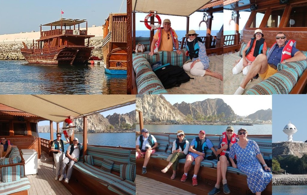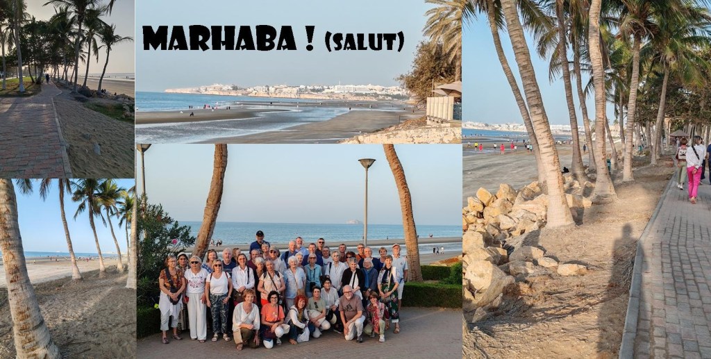 Bien que très rapide, la traversée de Mascate, baignée par les eaux du golfe d’Oman, adossée au massif Hajar, les façades blanchies à la chaux ornées de balcons ouvragés regroupés autour de la mosquée du Grand Prophète coiffée de mosaïques bleu et or, témoignent de la richesse des échanges maritimes. Une forte houle ne nous permettra pas de faire la croisière prévue.