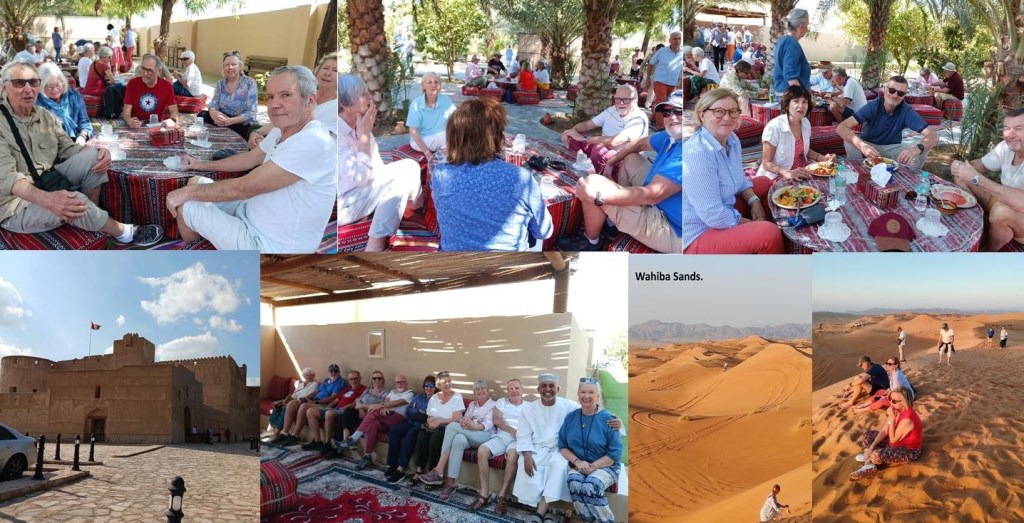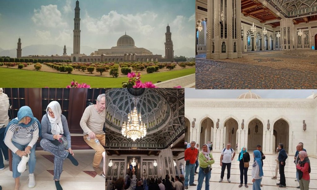 Le mardi 27 Janvier 2026, nous sommes 41 randonneurs qui atterrissons à Oman, et c’est Habib, notre guide qui nous accueille à Mascate. A peine débarqués nous visitons la Mosquée du Sultan Quabous. Ce lieu de prière cumule les superlatifs. Il a fallu 6 ans pour la construire. Elle arbore 5 minarets en référence aux 5 piliers de l’Islam. Capable d’accueillir 15 000 personnes. Suspendu au dôme central un lustre de 8 m de diamètre et de 14 m de haut, pèse 8 tonnes. Il est serti d’or et de cristal Swazrovski. Son gigantesque tapis de plus de 4 200 m² a nécessité le travail de 600 femmes pendant 4 ans.