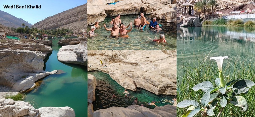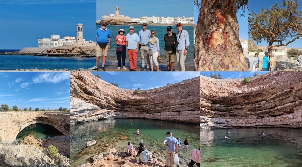 Mercredi 28 janvier: Sur notre route, un arrêt pour découvrir le Boswellia sacra, l’arbre à encens. Nous arrivons à Bimah Sinkhole. Il s’agit d’une dépression naturelle remplie d’une eau verte cristalline, et quelques uns ne peuvent s’empêcher de se jeter à l’eau. Nous nous dirigeons vers une palmeraie où nous sommes reçus gentiment par un agriculteur qui explique l’ensemencement des dattiers, et dégustons diverses variétés de dattes. Nous arrivons dans une spectaculaire profonde et étroite gorge appelée Wadi Tiwi, qui serpente le long de la montagne. L’eau y est chaude et nager est un plaisir, tandis que de petits poissons attaquent nos pieds pour nous débarrasser des peaux mortes. Après le repas, fort agréable chez l’habitant, nous partons à Sour, vers le seul chantier naval encore en activité, le constructeur de boutres. Deux bateaux sont actuellement en construction : un de 50 mètres de long, taillé pour des croisières, un autre plus modeste pour la pêche. Ici, le teck est roi. Ces bateaux représentent une partie de l’identité omanaise et c’est une grande fierté de continuer cette tradition de grands navigateurs. Après le repas du soir, peut-être allons nous voir une ou deux tortues pondre sur la plage. Hélas, attente vaine, nous ne verrons pas de tortue ce soir. Mais faute de mieux, Christian va nous mimer la ponte d’une tortue… tout le monde apprécie ses efforts, mais nous repartons bredouilles….